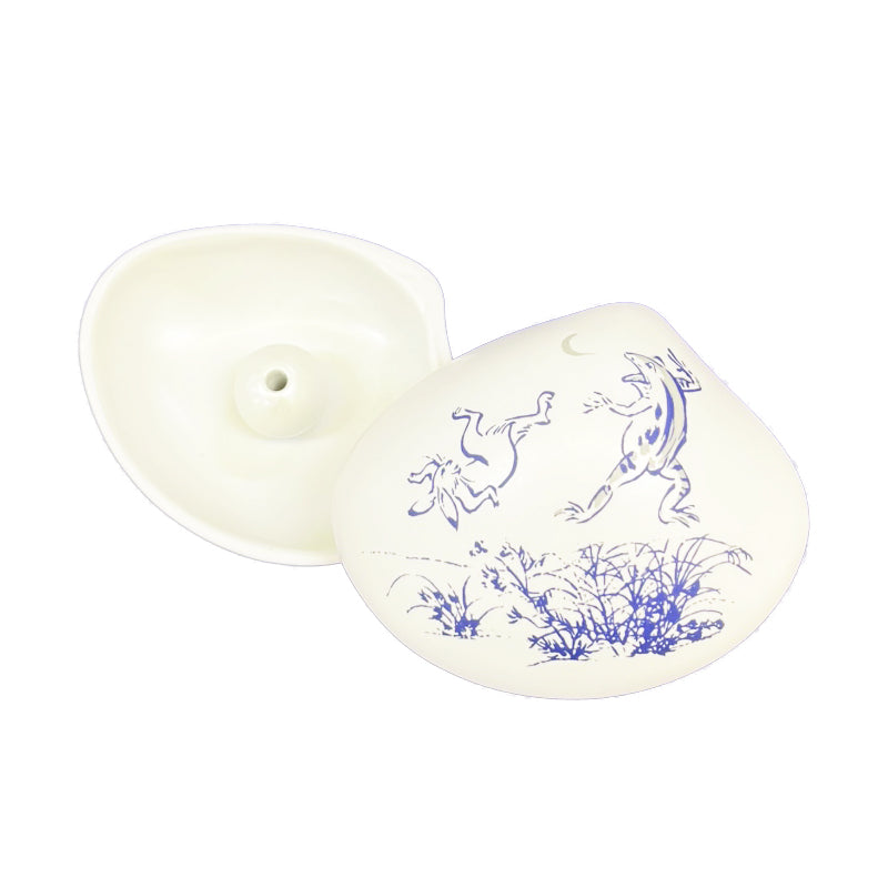「鳥獣戯画 相撲」は、うさぎとかえるが相撲している様子が可愛くユーモラスに可愛く描かれています。大切なお客様をお香の香りで出迎える玄関にて、使用後に蓋をしておけば気になる灰を外に出すこともありません。 素敵なインテリアとしてもお使い頂けます。