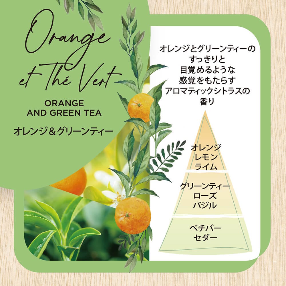 オレンジとグリーンティーのすっきりと目覚めるような感覚をもたらすアロマティックシトラスの香り