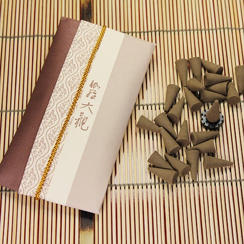 金色の紐をほどいて包みを開くとコーン型のお香と簡易香立、そして香りの特徴やお香のたき方を記した能書が入っています。