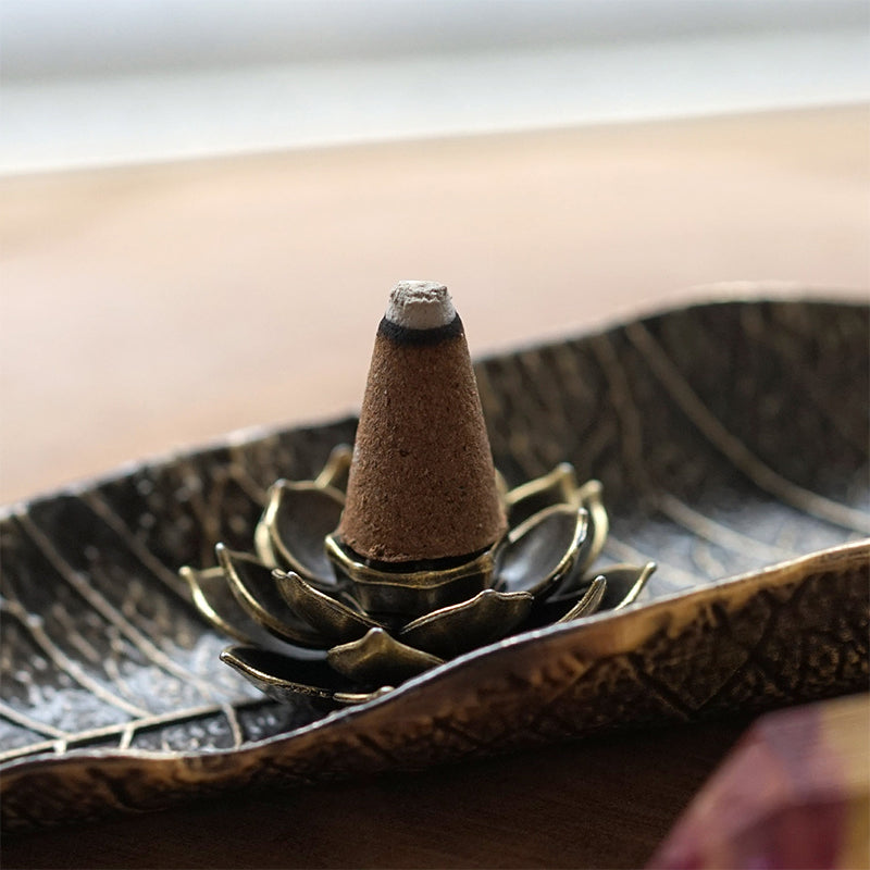 ホワイトセージを効率的に燃焼させる専用の香炉と、蓮の花をデザインしたコーン型お香用お香立てのセットです。