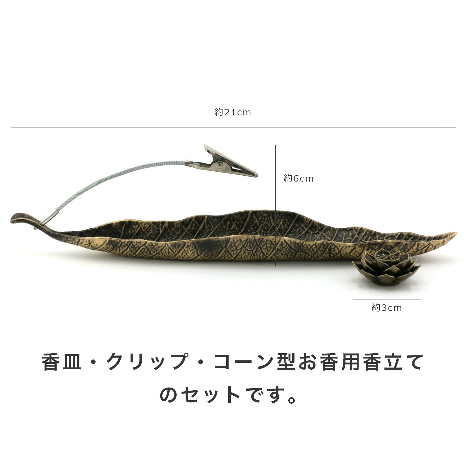 | 商品サイズ | ◎香皿(クリップ込み):長さ約21cm、高さ約6cm、幅約4cm ◎お香立て:長幅約3cm、高さ約1.3cm |