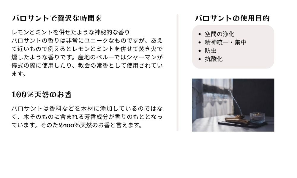 | 内容量 | 5本入り・パロサントの解説書+ポストカード |