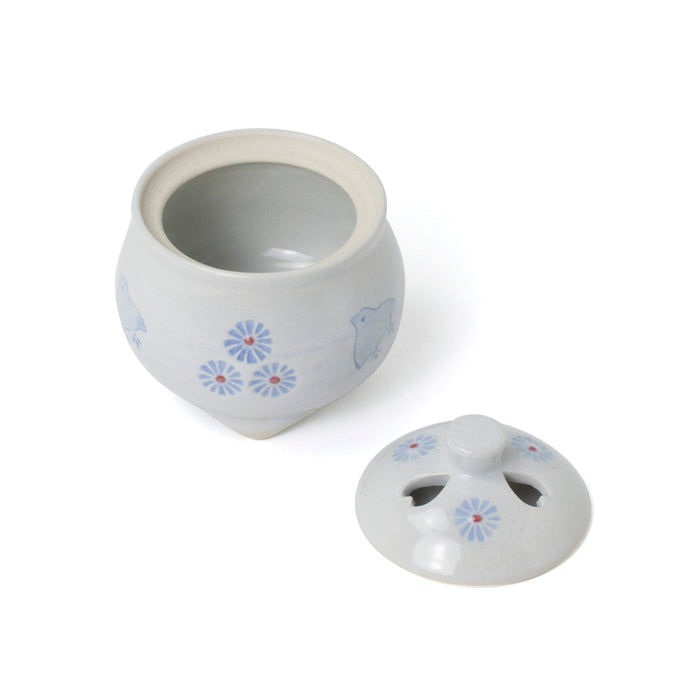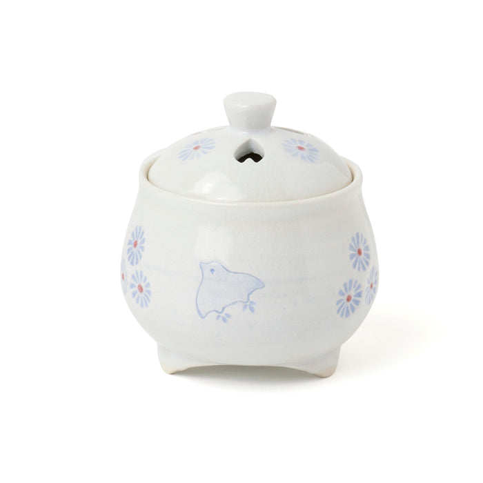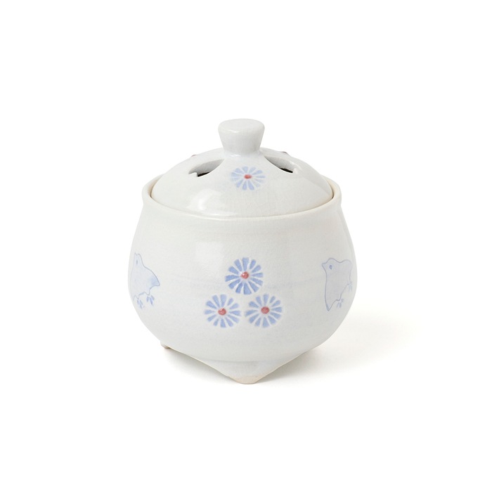 ぷっくりと丸みのある形が可愛らしい「香炉 花千鳥」。 優しく穏やかな白の釉薬に、淡く小花と千鳥をあしらっています。