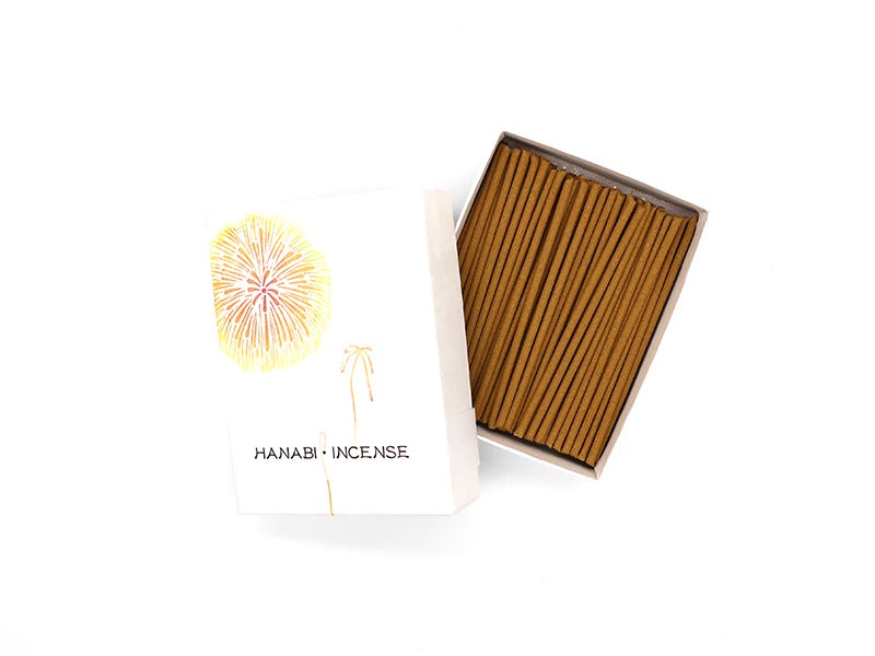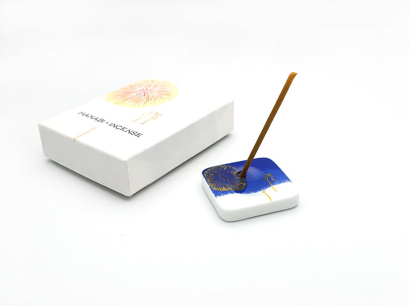 日本の美しい四季を版画風のパッケージと香りで表現しました。「HANGA インセンス 花火」は、真夏の夜を彩る花火をイメージしたフルーティーな香りです。ラズベリー・アップル等を調合しました。お揃いの柄の香立てもご一緒にどうぞ。