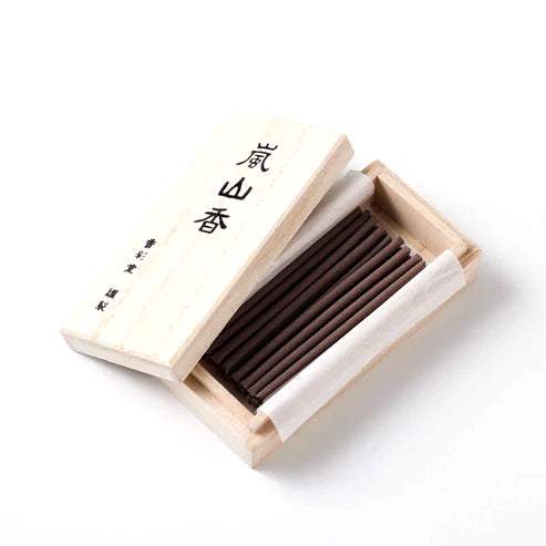 「嵐山の月影」梔子(くちなし)色にひんやりと川面に映る、嵐山の月影をイメージした灰色のお香です。エキゾチックで甘さを抑えた、大人っぽい香りです。保存に適した桐箱入りです。