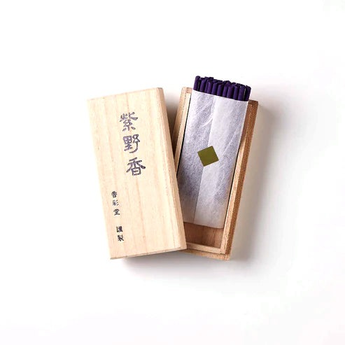 「紫野の夕霞」うっすらと滅紫にけむる紫野の夕霞をイメージした、紫色のお香です。フルーツの甘さの中に、すみれの香りをプラスしたセクシーな香り。保存に適した桐箱入りです。