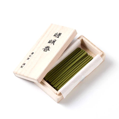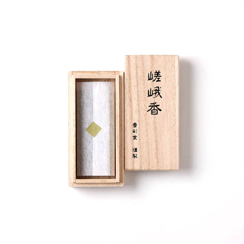 『山紫水明』は、四季毎に色合いを変える西陣織のような山々に囲まれ、友禅流しの名残をとどめる澄んだ川を抱く京都。そんな自然の香りをお香に托したシリーズです。「嵯峨の朝霧」浅緑の竹林をしっとり濡らす嵯峨の朝霧をイメージした、緑色のお香です。シンプルでクリーンな、草原の香り。保存に適した桐箱入りです。