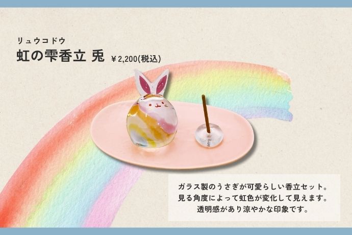 | 商品サイズ | 受け皿:幅約11.5cm×奥行約6.6cm・うさぎ:直径3.7~4cm×高さ5.3~5.5cm・お香立:直径約2cm×高さ約0.7cm |