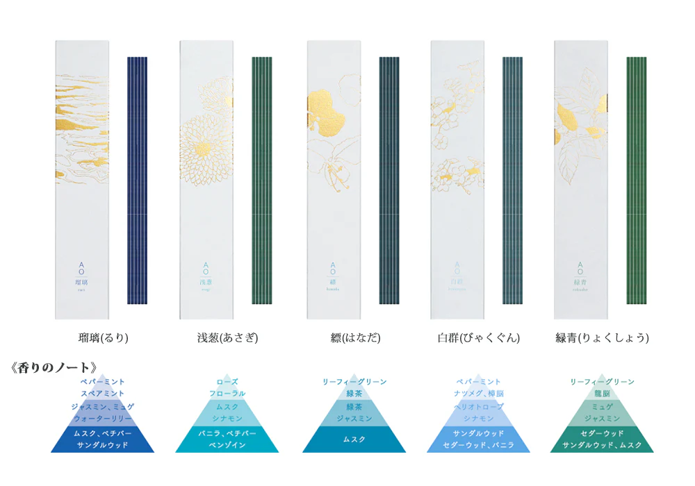 青の伝統色を香りで表現したお香。 お香のさまざまな青色のバリエーションも魅力。
